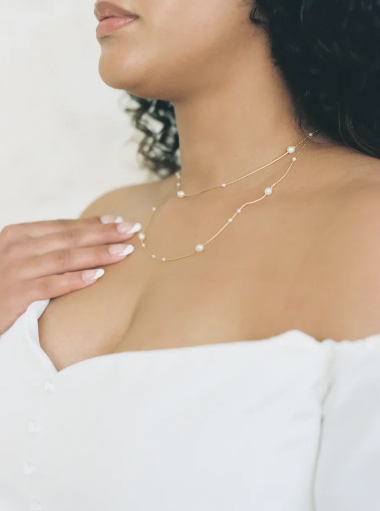 Necklaces and earrings are classic accessories that frame the face and neckline, adding shine and balance to a wedding look. Earrings can range from simple studs and delicate drops to statement chandeliers, while necklaces vary from subtle pendants and chokers to layered or more dramatic pieces. These accessories are typically chosen to complement the neckline of the gown and the bride’s hairstyle, with higher necklines often paired with statement earrings and lower necklines leaving room for a necklace. Bridal jewelry is commonly made from materials such as gold, silver, platinum, pearls, crystals, rhinestones, or gemstones, allowing brides to coordinate with other accessories and the overall tone of their wedding. Whether the style leans timeless and minimal or bold and glamorous, the right combination of earrings and a necklace can enhance the dress, highlight facial features, and tie the entire bridal ensemble together with a polished finishing touch. At S+B we do have a limited selection of necklaces and earrings, but you will still be able to find some gorgeous pieces from Elizabeth Bower, Untamed Petals, Haute Bride, and more.