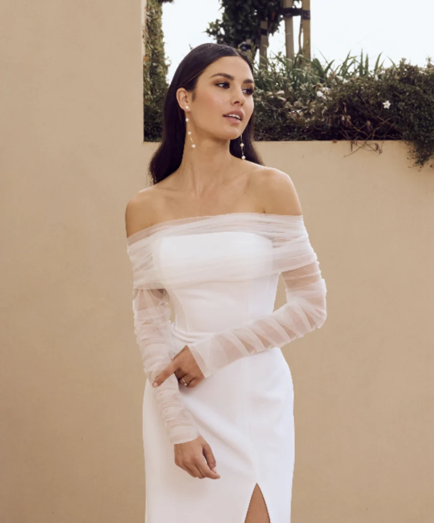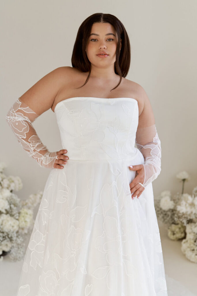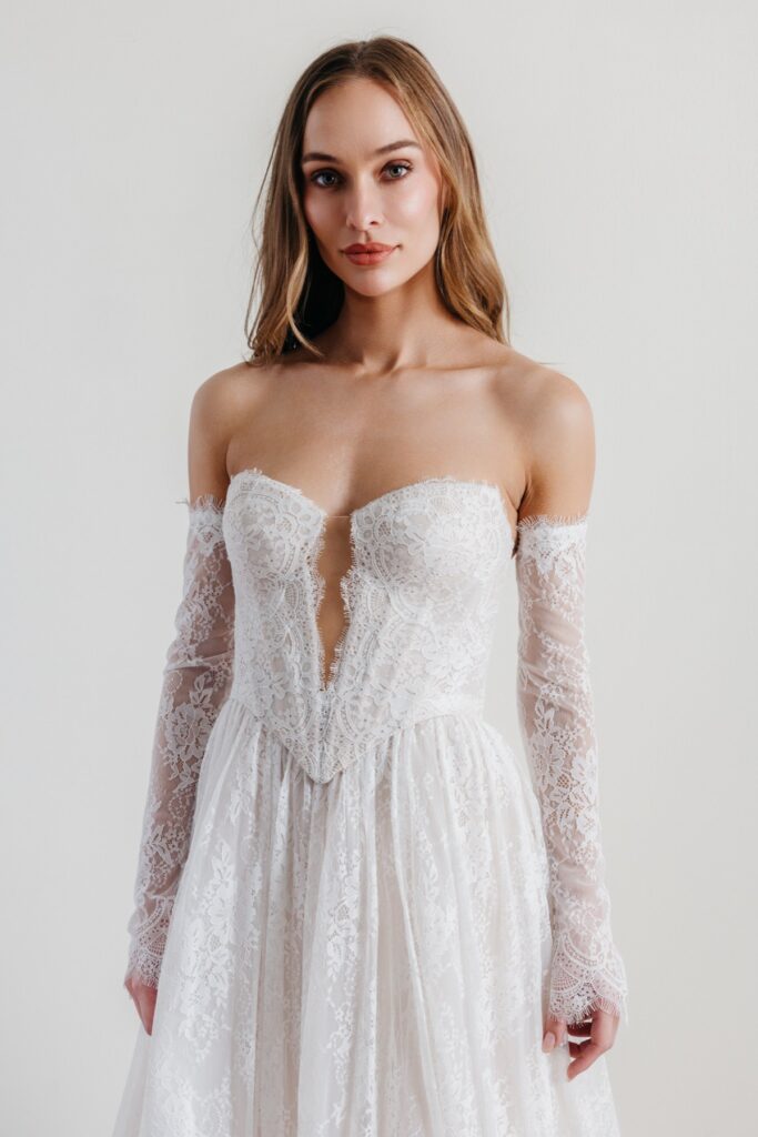 Some wedding dresses will come with sleeves attached, and some will come with detachable sleeves. Sleeves are a timeless and versatile element that can completely transform the silhouette and style of a wedding gown. Dresses with detachable sleeves will attach directly to the bodice of the dress and can range from delicate cap sleeves to long, fitted sleeves or flowing bell and illusion styles, allowing brides to add coverage, elegance, or drama depending on their preference. Common materials include lace, tulle, chiffon, satin, and sheer illusion fabrics, often embellished with embroidery, beadwork, or appliqués to match the gown. Historically, sleeves have played both functional and symbolic roles in bridal fashion, from modest Victorian long sleeves to the romantic, flowing styles of the 20th century, and they remain a popular choice for brides seeking a balance between tradition and modern flair. Whether providing coverage for a formal ceremony, enhancing the gown’s lines, or adding intricate detail, bridal sleeves are a thoughtful way to personalize a dress while creating a cohesive and elegant look from every angle. One great thing about S+B is you can mix and match designers. Just because your dream dress doesn’t offer sleeves, you can find another dress that has sleeves, and add that to your wedding look! Some of the designers that offer sleeves at S+B are Locket, Willowby, Enzonai, Truvelle, Laudae and more!