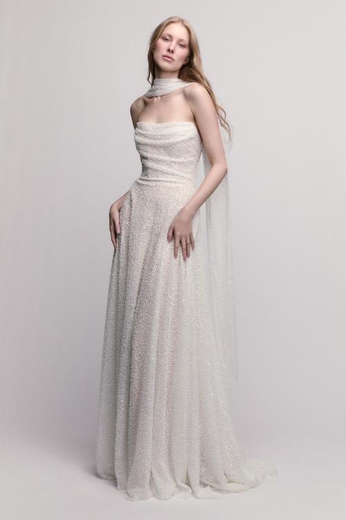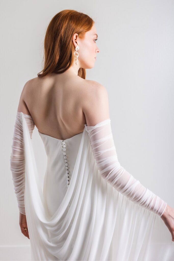 In 2024, bridal scarves started to rapidly grow in popularity, and we aren’t complaining! Scarves are an elegant and versatile accessory that can add softness, coverage, and movement to a wedding look. Typically draped around the shoulders, over the arms, or loosely around the neck, bridal scarves are often made from lightweight, flowing materials such as chiffon, silk, tulle, or soft lace so they complement the gown without feeling heavy. They can be worn simply as a wrap for warmth during outdoor or cooler-weather weddings, or styled more intentionally to create a romantic, flowing effect in photos. Styles range from sheer, minimalist scarves to embroidered or lace-edged designs that add extra detail to a simpler dress. Easy to drape and adjust throughout the day, bridal scarves offer both practicality and a graceful finishing touch to a bridal ensemble. They are easy to take on and off, making second looks, or an after party look easily achievable. Designers that offer scarves at S+B are Divine Atelier, Willowby, Watters, and more.