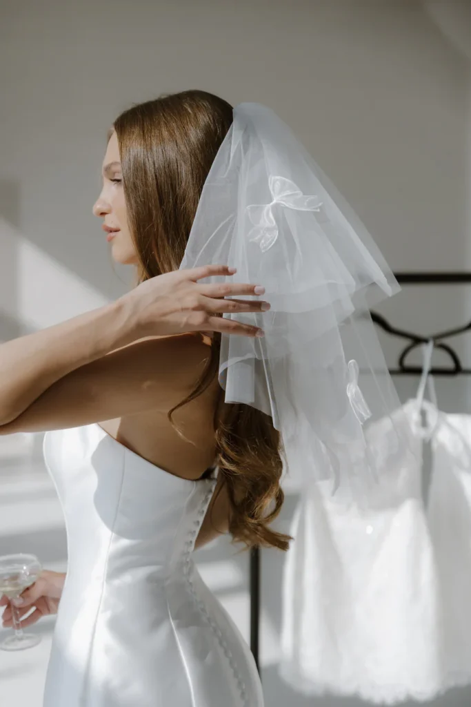 When you think of wedding accessories, we bet you thought of veils first. Bridal veils are one of the most iconic wedding accessories, adding movement, tradition, and a touch of romance to a bride’s look. Typically attached to a comb or pins and secured into a hairstyle, veils are designed to drape gracefully over the head and shoulders, with lengths ranging from short birdcage veils that frame the face, to dramatic cathedral veils that trail several feet behind the gown. Throughout history, veils have symbolized everything from modesty and protection to elegance and celebration, dating back to ancient wedding traditions where they were believed to ward off evil spirits. Today, they are more about personal style than symbolism, with options including single-tier and multi-tier designs, lace-edged veils, fingertip lengths, chapel styles, and embroidered or embellished pieces. Most of the veils we offer at S+B will be made out of lace, tulle or both! Some of the designers we carry that offer veils are Veil Trends, Locket, Untamed Petals, Senstudio, and more!
