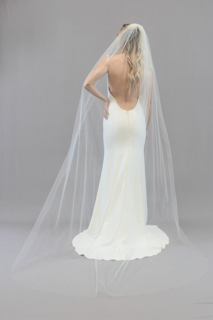 Non-traditional and alternative brides love capes, as they offer something different from a veil. Capes are a dramatic and elegant accessory that flows from the shoulders or neckline of a wedding dress, creating movement and visual impact similar to a veil but with a more modern, fashion-forward feel. They typically attach discreetly at the shoulders, straps, or back of the gown using snaps, hooks, or small fasteners, allowing them to drape smoothly down the back. Bridal capes come in a variety of styles, from short shoulder capes to sweeping cathedral-length designs that trail behind the bride. They are often made from airy materials such as tulle, chiffon, lace, or organza, though some feature heavier embroidery, beading, or appliqué for added detail. While capes have appeared throughout fashion history as symbols of elegance, status, and drama, their use in bridal fashion has grown in popularity in recent years as brides seek alternatives to traditional veils. Capes are loved for their versatility and statement-making effect, offering a graceful layer that can add coverage, highlight the silhouette of a gown, and create a striking entrance down the aisle. Some designers that offer capes at S+B are Willowby, Pronovias, and Enzonai.