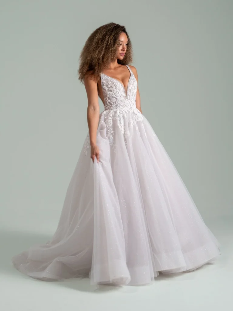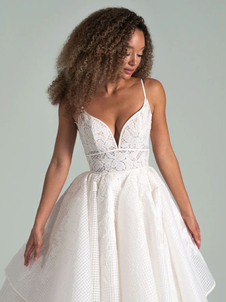 “Wingardium was always meant to feel like a spell well-cast — weightless yet powerful, luminous yet ethereal.” That’s from Hayley Paige herself, and it shows. This is a full-on ballgown moment: orchids embroidered on tulle, plunging V-neckline framed in rhinestones, subtle dégradé at the hem, side cutouts that bring edge. It’s for the bride who wants drama, movement, and a bit of magic.