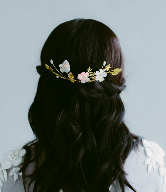 A beautiful floral comb that adds the perfect final touch to your wedding day hairstyle. Made in gold and featuring ivory marble silk flowers with brass leaves, Tallulah is romantic, delicate, and so effortlessly pretty.
