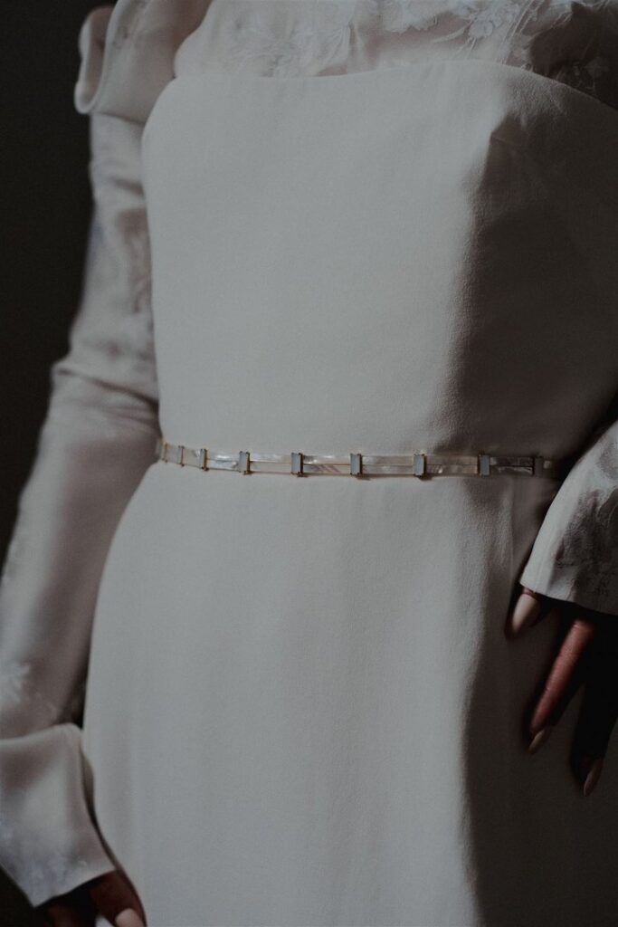 A dreamy satin belt adorned with mother of pearl and gold details, Harriet is the kind of small-but-special piece that adds a beautiful finishing touch to your bridal look.